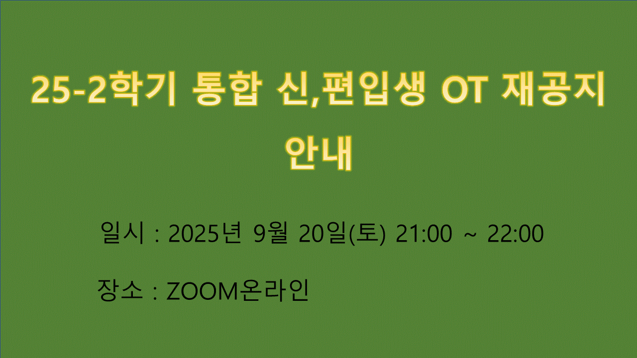 [25-2학기 통합 오리엔테이션 재공지 안내] 일시 : 2025년 9월 20일(토) 오후 21시 ~ 22시 장소 : ZOOM 온라인 링크 : https://us06web.zoom.us/j/82384473514?pwd=HGJHvtj214IPp0mCoxEoOiPapxwI5B.1