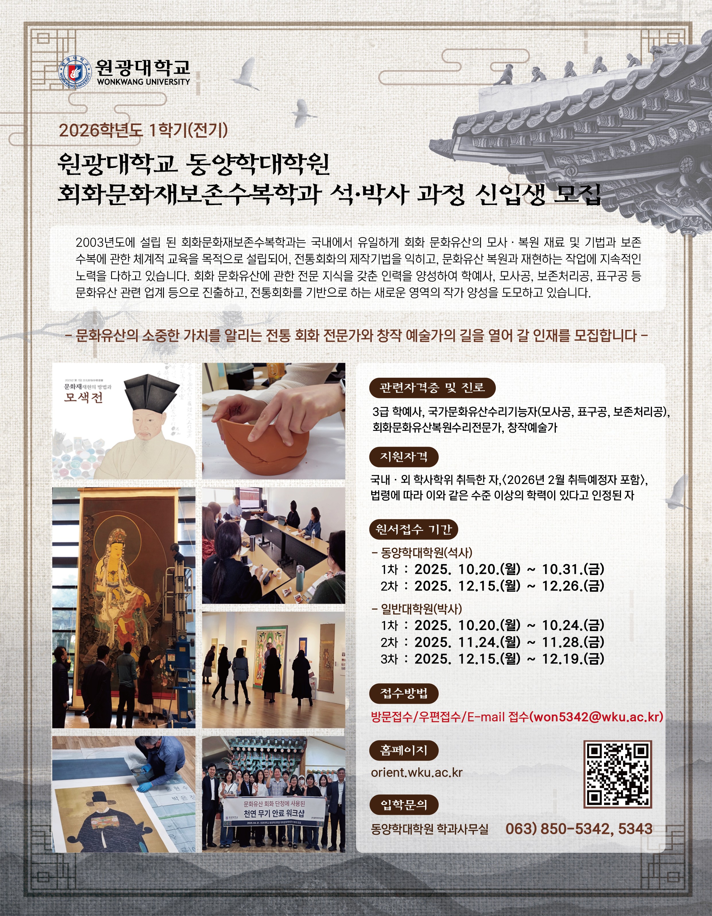 원광대학교 동양대학원 회화문화재보존수복학과 석.박사 과정 신입생 모집 안내