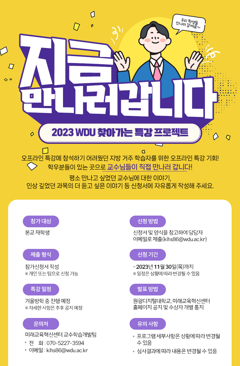 | 제목 | WDU 찾아가는 특강 - 지금, 만나러 갑니다! !(~11.30.) | 등록일 | 2023-11-01 | 조회수 | 136 |