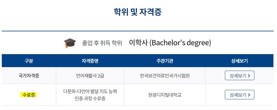 원광디지털대학교 홈페이지> 대학소개> 언어치료학과> 학과소개 내용 중 ‘수료증’ 표기 부분이 과거 ‘민간자격증’으로 노출되어 혼선이 있었습니다.