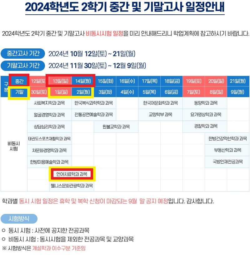 | 제목 | [시험] 24-2학기 중간 및 기말고사 비동시 시험 일정안내 | 등록일 | 2024-09-13 | 조회수 | 400 |