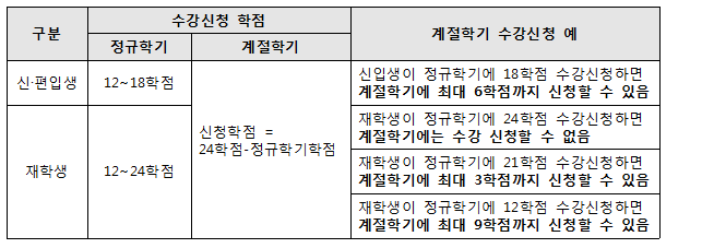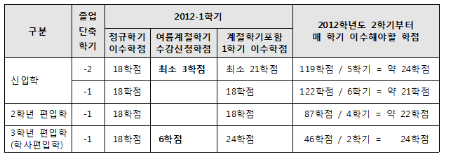 ※ 계절학기에 개설되는 과목은 극히 제한적이므로 조기졸업을 희망하는 학생은 입학 첫 학기를 제외하고