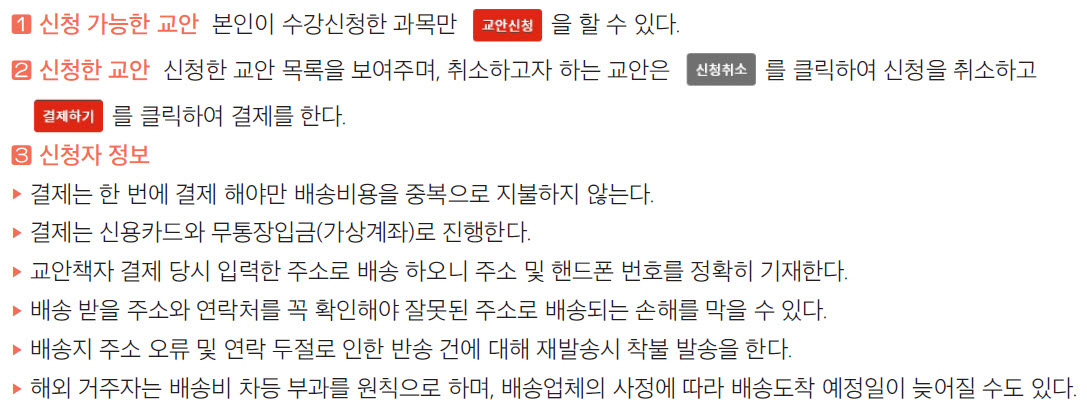 ◼ 우리 대학은 수업을 위해 교수님이 작성한 교안을 과목별 자료실에 파일형태로(PDF) 제공하고 있습니다. ◼ 학습자 스스로 과목 자료실에서 교안 파일을 참고 또는 출력하여 스스로 활용할 수 있으나, 학우님들의 다양한 제한적 환경을 고려하여 대행 서비스를 시행하고 있습니다. ◼ 교안은 과목에 따라 자료실에 PDF 파일 제공으로 제한하거나, 교안이 없는 과목도 있으므로 과목별 강의계획서를 확인 후 신청하시기를 바랍니다. ※ 교안 책자 제작 및 발송 대행 서비스를 이용하고자 하는 학우님께서는 아래 일정 및 유의 사항을 반드시 확인하시고 신청하여 주시기를 바랍니다. |
