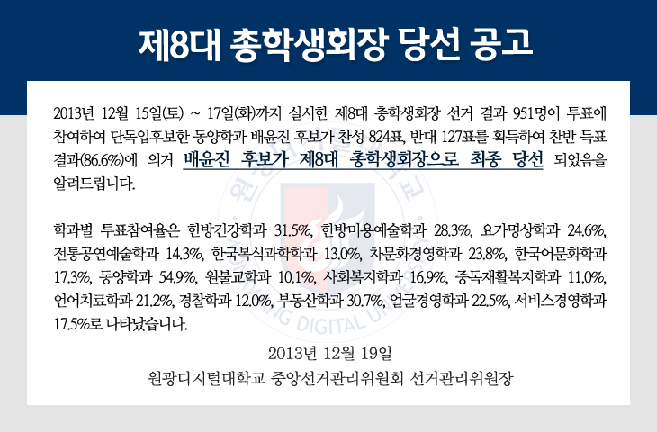 제8대 총학생회장 당선 공고