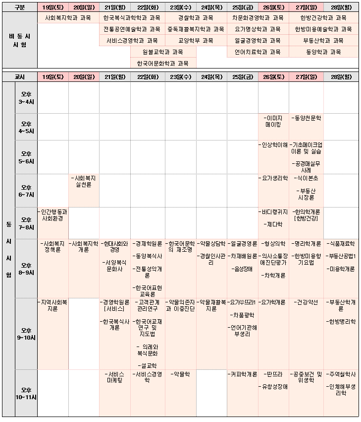 다. 과목별 시험시간 및 시험관련 상세내용은 과목공지게시판에서 꼭 확인하시기 바랍니다.