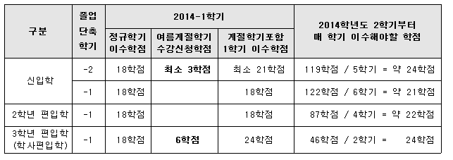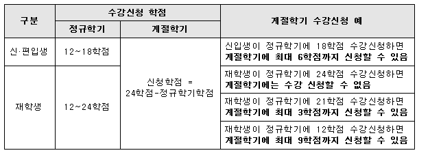 ※ 계절학기에 개설되는 과목은 극히 제한적이므로 조기졸업을 희망하는 학생은 입학 첫 학기를 제외하고 정규학기를 통해 필요한 학점을 이수해야 함