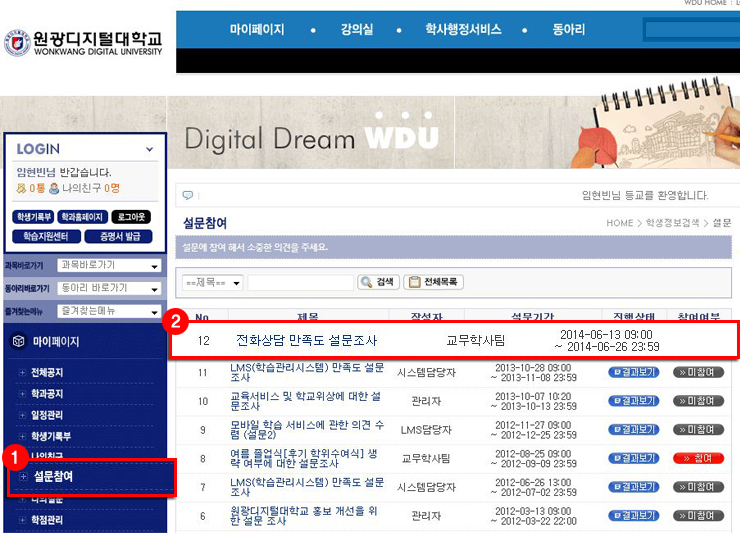 나. 등교하기(로그인) 왼쪽메뉴 → [설문참여] 클릭 → '전화상담만족도조사' 제목 클릭