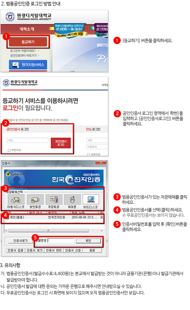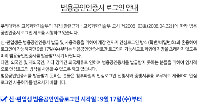 신·편입생은 범용공인인증서 발급 및 사용적응을 위하여 개강 전까지 안심로그인 방식(학번/비밀번호)과 혼용하여 로그인이 가능하지만 9월 17일(수)부터는 범용공인인증서로만 로그인이 가능하므로 학업에 지장을 초래하지 않도록 미리 범용공인인증서를 발급받으시기 바랍니다.