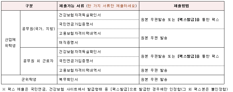 2) 단, 국민연금가입증명서 또는 건강보험자격득실확인서를 팩스발급한 팩스본은 인정합니다.