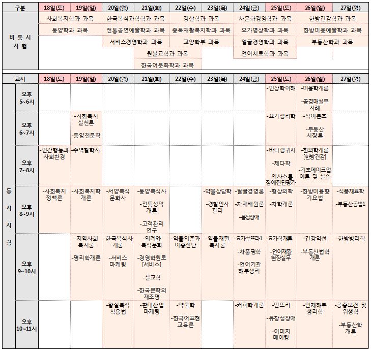 다. 과목별 시험시간 및 시험관련 상세내용은 과목공지게시판에서 꼭 확인하시기 바랍니다.
