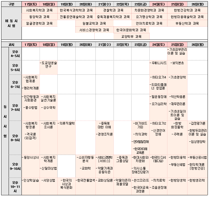 다. 과목별 시험시간 및 시험관련 상세내용은 과목공지게시판에서 꼭 확인하시기 바랍니다.