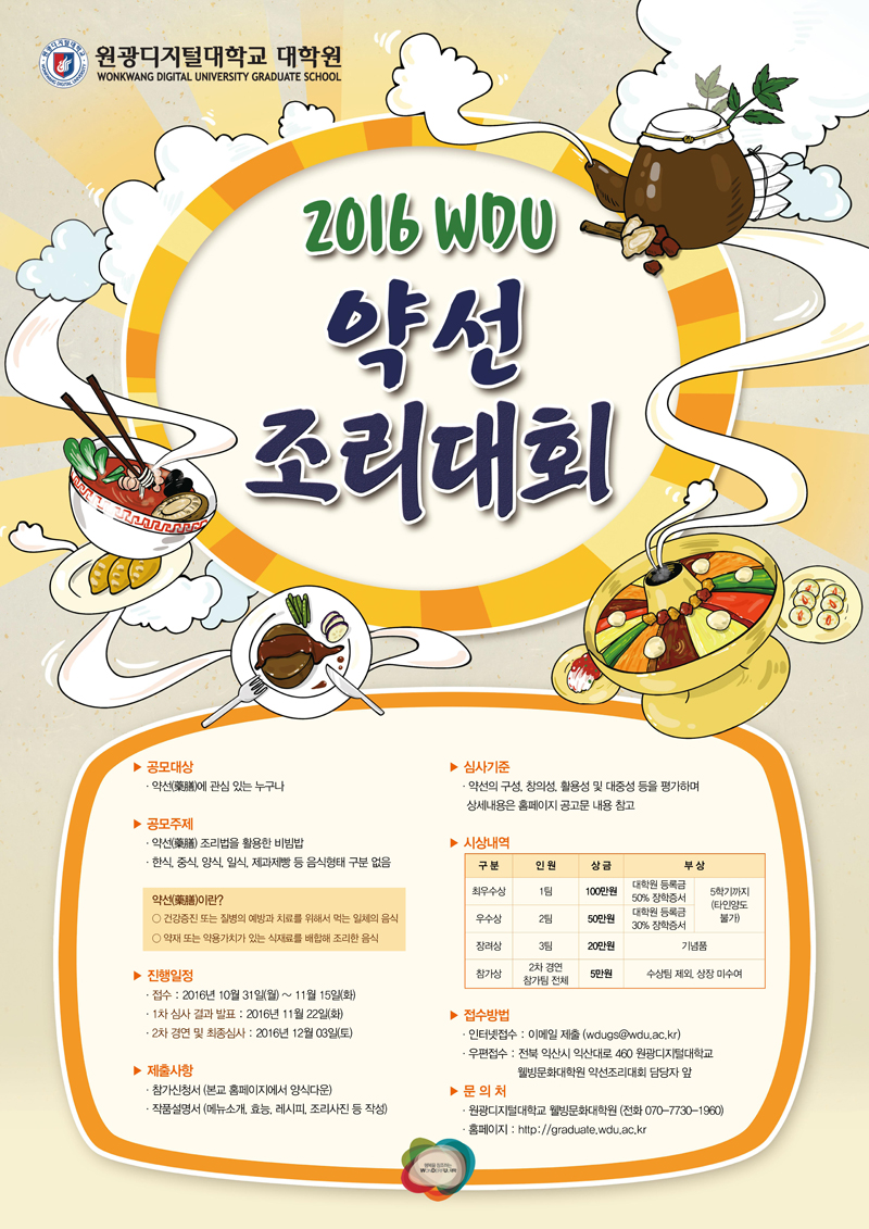 원광디지털대학교 웰빙문화대학원에서는 2016 WDU 약선조리대회를 아래와 같이 진행하오니