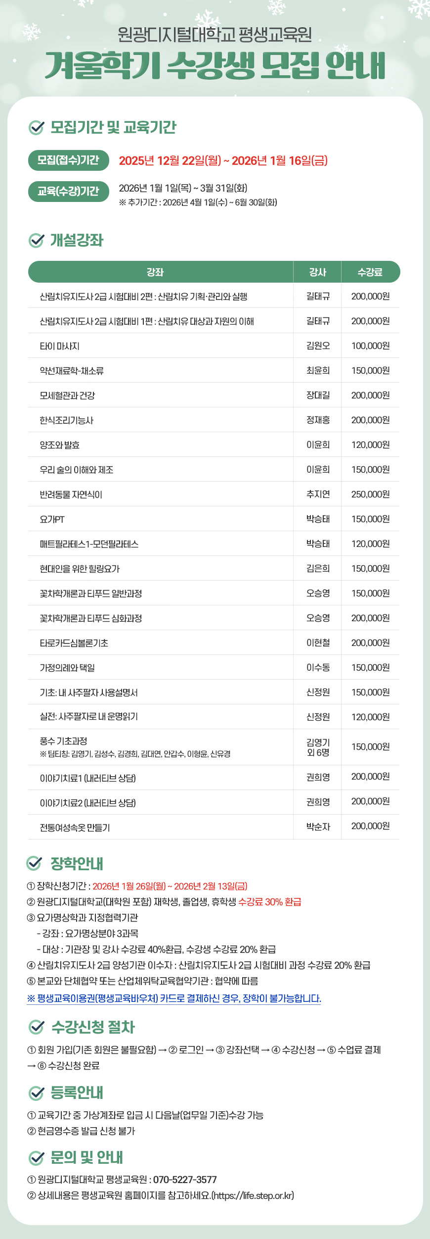 이번 겨울학기 수강 신청 및 강의 일정, 상세 커리큘럼 등은 원광디지털대학교 평생교육원 공식 홈페이지(https://life.step.or.kr)에서 확인할 수 있다.